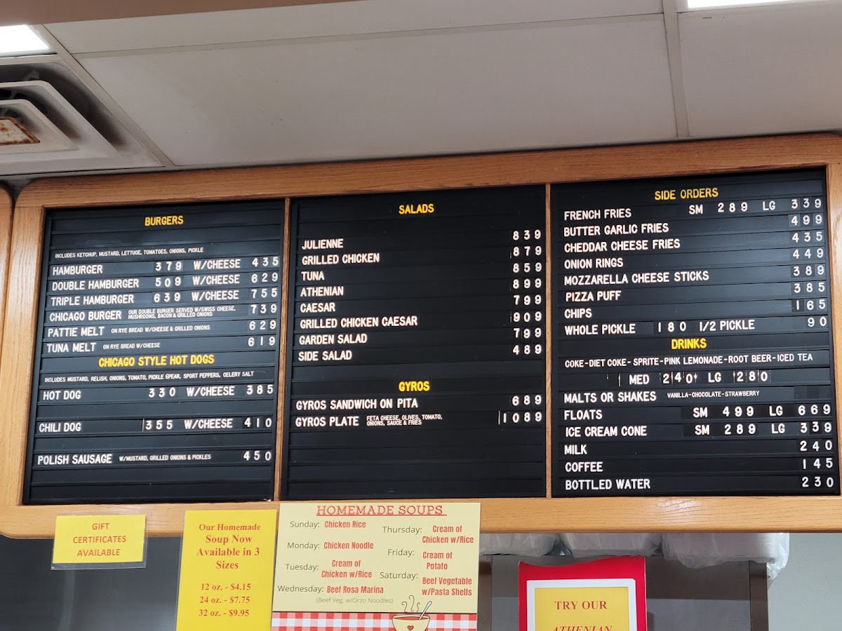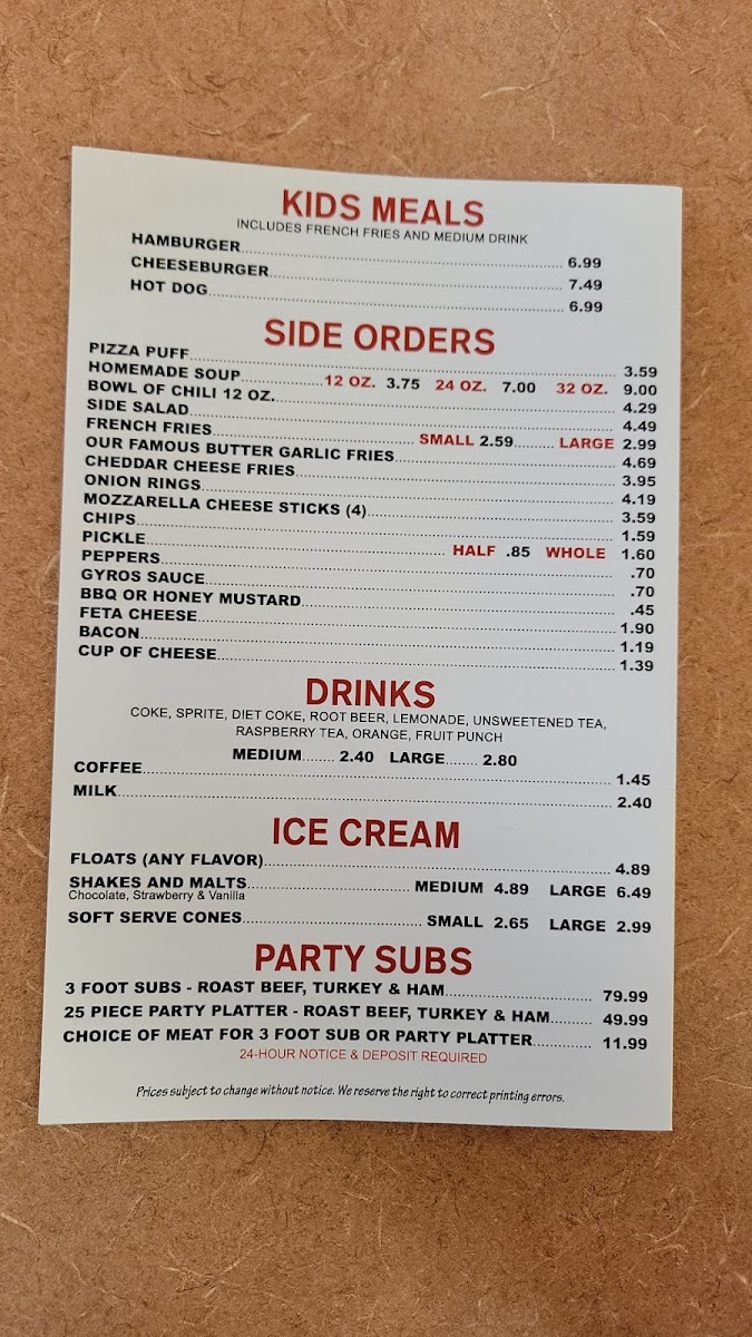 The menu features a variety of crowd-pleasers like gyros served with fresh pita, stacked subs filled with traditional deli meats and cheeses, and well-loved sides such as their signature butter and garlic fries or crispy mozzarella sticks. Soups and simple plates add to the comforting variety, rounding out options for anytime meals—from a midday snack to a late-night craving.